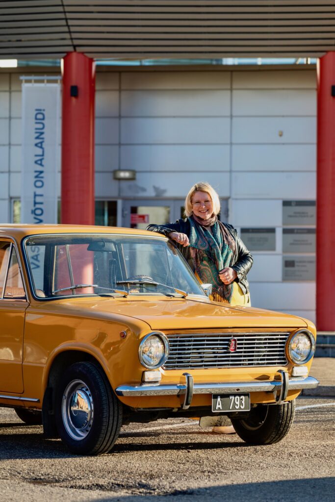 Selle sinepikollase Žiguli sai Reelika oma 40. sünnipäevaks. Must numbrimärk tunnistab, et tegu on erilise eksemplariga – nagu Reelika isegi. Foto: Kristi Kuusmik-Orav